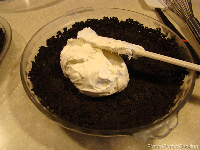 In a food processor, chop cookies until they are fine crumbs. Combine the cookie crumbs with the melted butter. Pour half of the mixture into each pie plate and press into the bottom and up the sides to form your crust. I use a piece of wax paper to do this so it doesn’t stick to my hands. Chill for 2 hours.