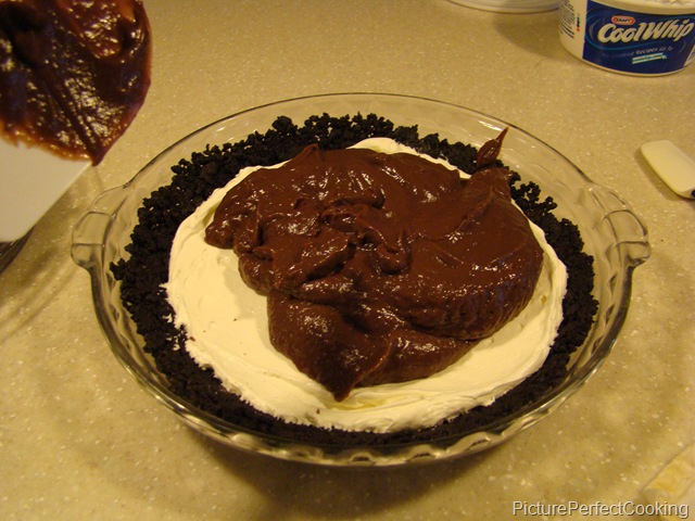 Top the pies with the remaining Cool Whip and spread to coat the pudding layer. One of my pie plates is bigger than the other, so I let the pudding mix show on the biggest pie. Complete by crumbling the remaining cookies over the top of each pie. Refrigerate before and after serving.