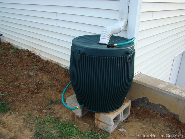 Since we plan on having a small garden this year, the thought of collecting rainwater to take care of it was very appealing. Our “city” water is very chlorinated and hard on vegetation. We found a deal on 2 rain barrels online and took the plunge. Thursday evening, we went to work. I started by leveling out the area where the barrels would go. C finished that and moved 2 cement blocks on which to set the first barrel. We are planning on getting a few pretty wall-building blocks from Lowe’s to finish. Our plan is to lay landscape fabric underneath and then the wall blocks and then the barrels, but this will do for now because we wanted to test it.