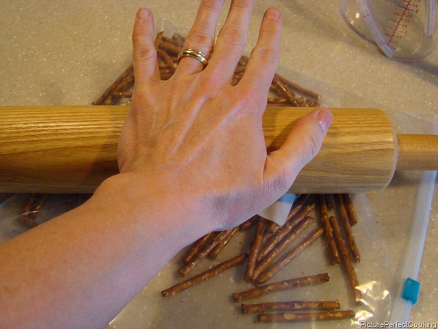 Crust: Place pretzels in a zip-top bag and seal. Crush with a rolling pin. Combine crumbs with melted butter and 1/4 cup granulated sugar. Press into a greased 13×9” pan. (Since I was taking it to 2 dinners, I used two 8” pans. It will not be quite as thick.)