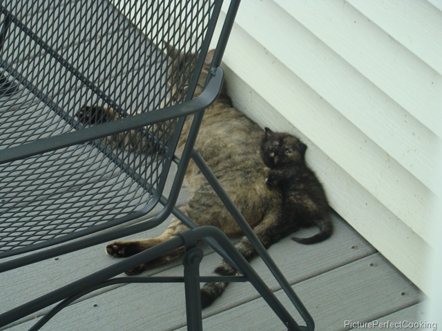 She presented her baby to us earlier this week. Again, I was not getting attached. I was not feeding her here, she could still go to where the food usually is. I was not going to worry about her. They would be fine on their own. I said it before, I’ll say it again…I’VE BEEN SCHNOOKERED!!!! When Mama-C came to the door yesterday morning, I broke down and gave her a plate of food. When the storms came, C & I worried about where she took the baby. They were fine, by the way, hiding under our bay window on the deck. I was trying to be all tough until I took one look at this…