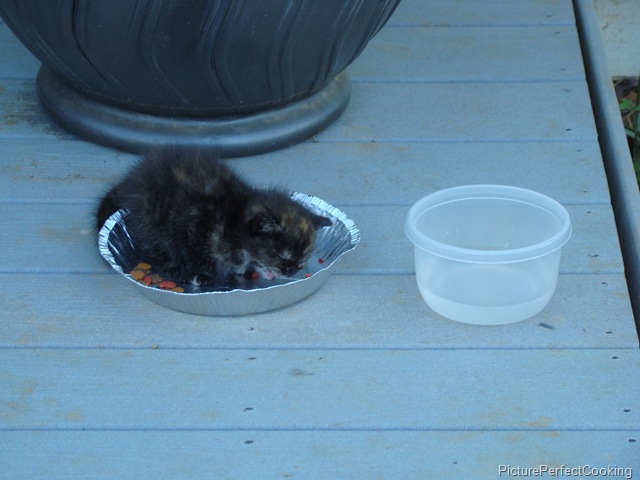 It was just yesterday (ok, last week) that our wee kitten was nursing it’s mother. Now it’s a big cat munching on cat food! We fed Mama-C this afternoon and after she ate her fill and wandered away, I heard crunch, crunch, crunch. I was surprised to see the little one eating away at the leftovers. Baby-C didn’t want to share either. When I would get close, the hair on it’s back would rise. When Patches got closer, it started hissing and spitting.