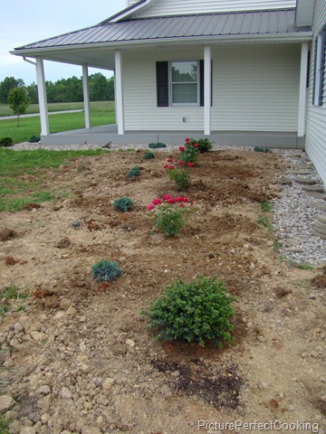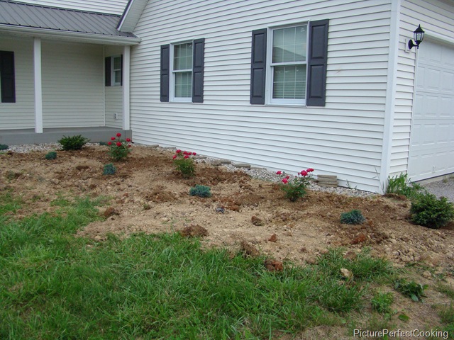 I know I already had a Wordless Wednesday post, but I was so excited with what we accomplished today that I just couldn’t wait. C & I are working on a few landscaping projects this spring. I plan on doing a before and after photo show when these are done, but I had to throw in a few “during” shots. Since rain is expected for the next few days, we were trying to finish up the planting in front of the garage. We leveled the dirt Monday and yesterday, and I had hoped to get the chance to plant today if we could beat the rain. We did!! Also, there was a package on my front porch when I got home from Miller’s Nurseries in New York. Guess what, now I had 25 Tribute strawberry plants as well! Can you believe it…we got it all done! YAY! Here is the proof. The 3rd picture is the strawberry bed.