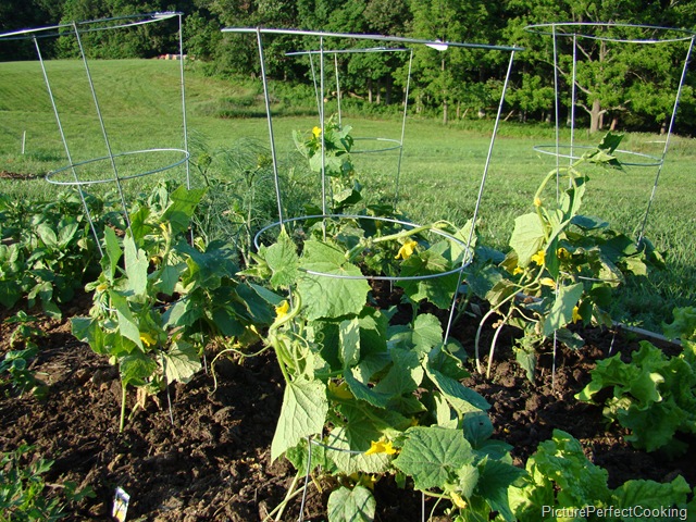 It is now the first of June!  This year is really flying by.  I wanted everyone to see the progress of our little garden project.  The first photo shows the overall bed, and, my, how it has grown.  I have already harvested several heads of lettuce, and the cucumbers are not far behind.  They are loaded down with blooms and baby cucumbers.  I do have a bare spot where the carrots were supposed to be.  New planted carrot seeds + hard heavy rains = NO CARROTS!  The seeds washed away.  I have now resown them, so hopefully we will see evidence soon.  The cucumbers are climbing the tomato cages well, as you can see in the second photo.  I can’t wait for this certain cucumber salad recipe that I have.  I will have 2 of the ingredients freshly grown in my garden, the cukes and the dill.  I will pass along that recipe when I have the good stuff ready.