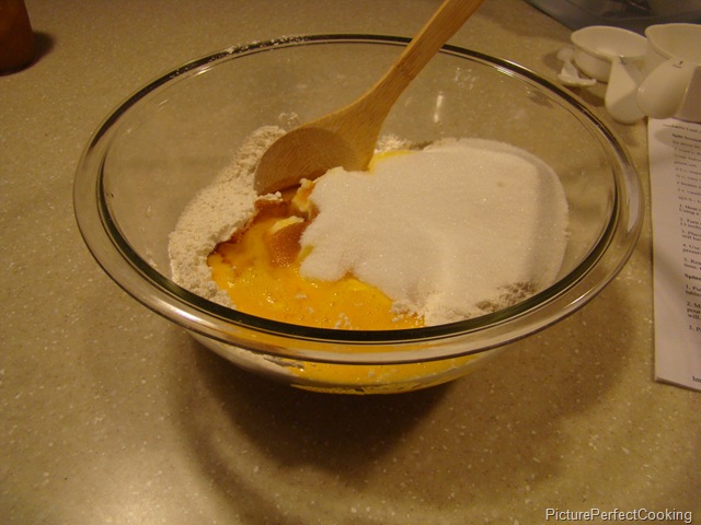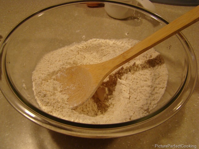 Heat oven to 350 degrees. Put dry ingredients in a shallow mixing bowl and stir to combine. Using a wooden spoon, work in the butter, egg and vanilla just until you have a cohesive dough.