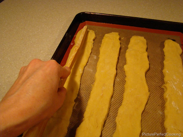 Place logs well apart on a ungreased baking sheet. I used a Silpat baking mat. Use the handle of a wooden spoon to press a deep trough down the center of each log.