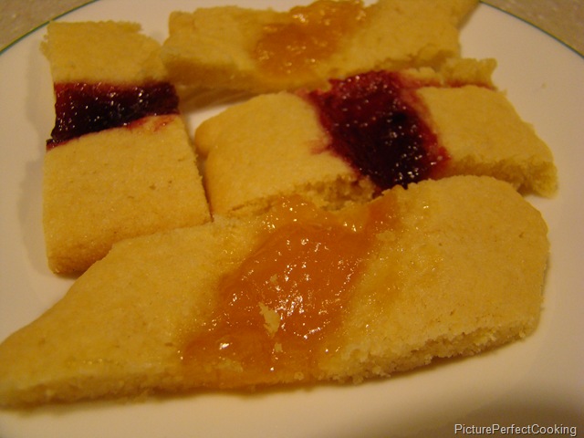 I made mine with homemade (by my mom and grandmother) peach and blackberry preserves, but you can use any flavor you like. The cookies by themselves would make wonderful butter cookies, but the fruit filling really adds to them. Here is a little word of warning: I made my cookies too thin and they would break when you tried to eat them. Only roll them out about 1 inch thick, no less.