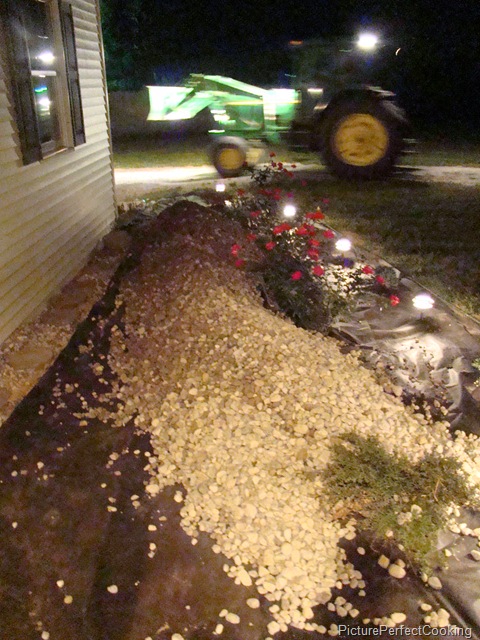 The front yard landscaping is almost done! A local home improvement store delivered 8 scoops of landscape rock yesterday and C’s dad was available to spread it tonight! A big green tractor with a front-end loader and a father-in-law that is willing to help are wonderful things! Thanks again!