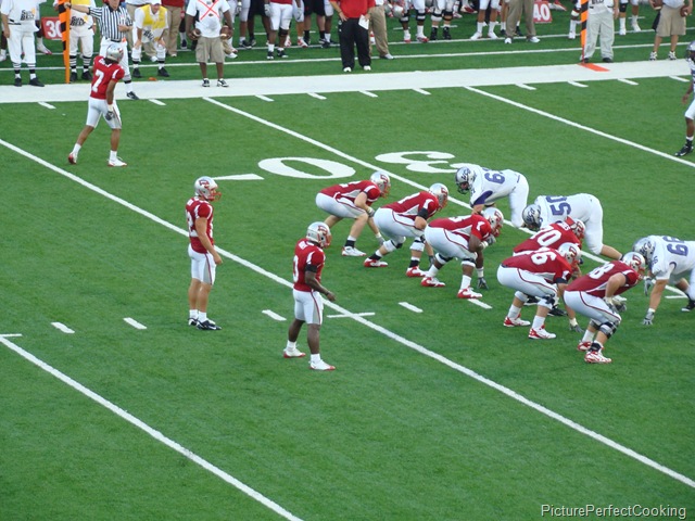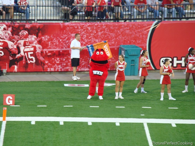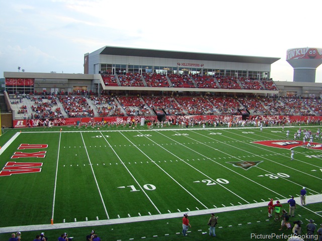 Saturday night C & I attended a college football game at his alma mater, Western Kentucky University against Central Arkansas. The game didn’t go so well with UCA winning 28-7, but we had a blast. It had rained off and on all day, but at game time, the weather was perfect!