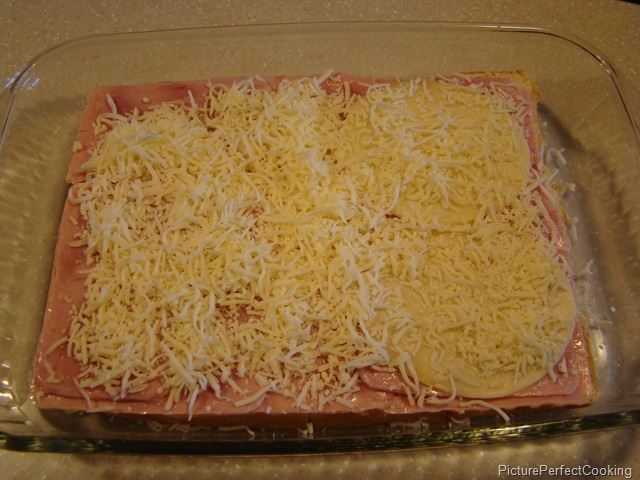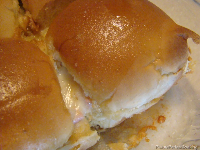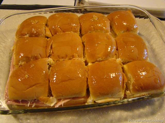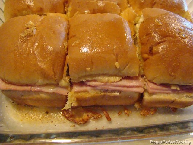 Place 2 layers of ham and a layer of cheese on the bottom half of the rolls. Replace top layer of the rolls and slice through ham and cheese to form small sandwiches.