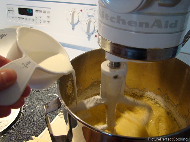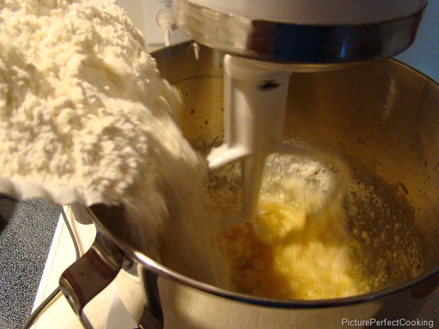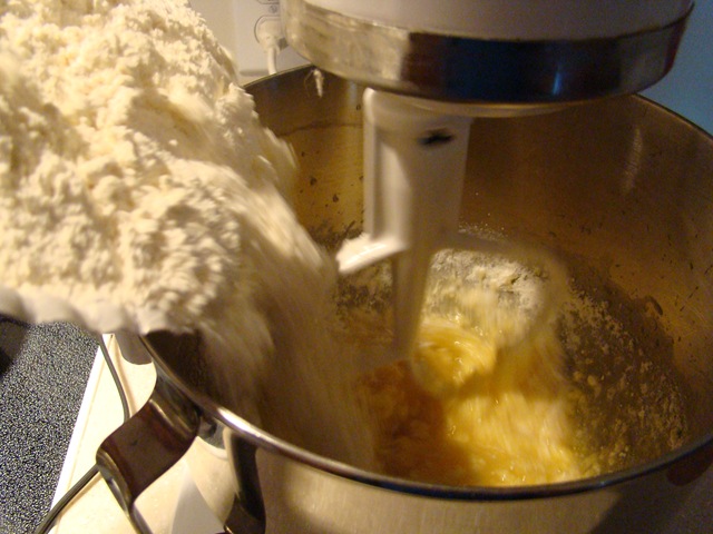 Sift together flour and baking soda. Stop mixer and scrape down the sides of the bowl. Add dry ingredients at low speed.
