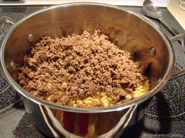 Preheat the oven to 375 while these are cooking. Spray a 13×9” baking dish with non-stick spray. Drain the pasta and put back into the pot. I do this so I don’t mess up another bowl.