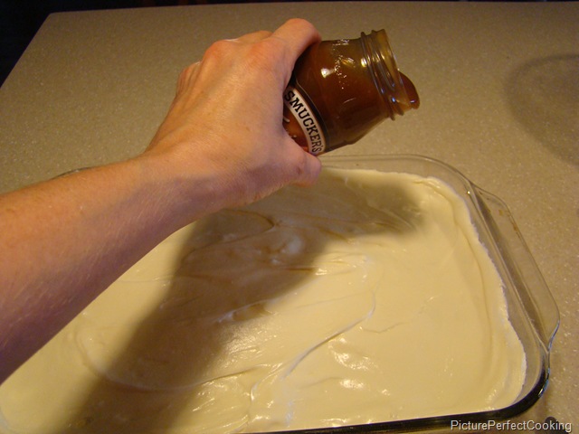 Spread the frosting over the cooled cake. Pour the remaining jar of caramel topping over the frosting in a zigzag pattern. Drag a butter knife through the topping to create your desired design. Store tightly covered in the refrigerator for up to 5 days. (If it lasts that long!)