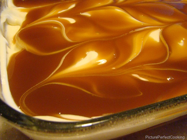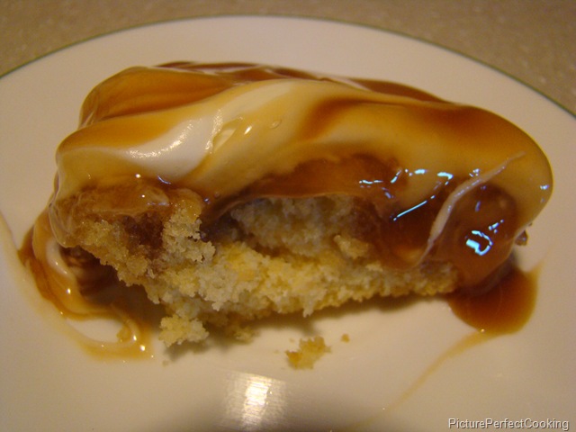 Using a wooden spoon handle, poke several holes in the warm cake. Pour 1 jar of caramel topping over the cake. Let it sit at room temperature for several hours to absorb all of the caramel.