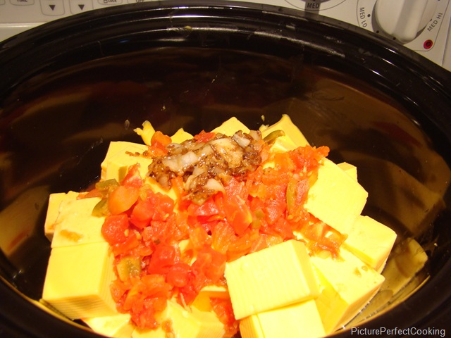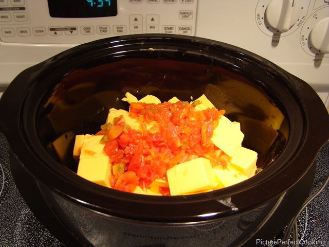 Cut up the cheese into cubes and place in the crock of a slow cooker. Pour the tomatoes over the cheese.