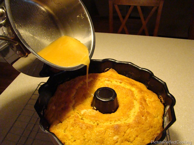 After the cake is removed from the oven, poke holes in the cake using a long fork or thin knife.  Pour the sauce over the warm cake and allow to soak into the cake.
