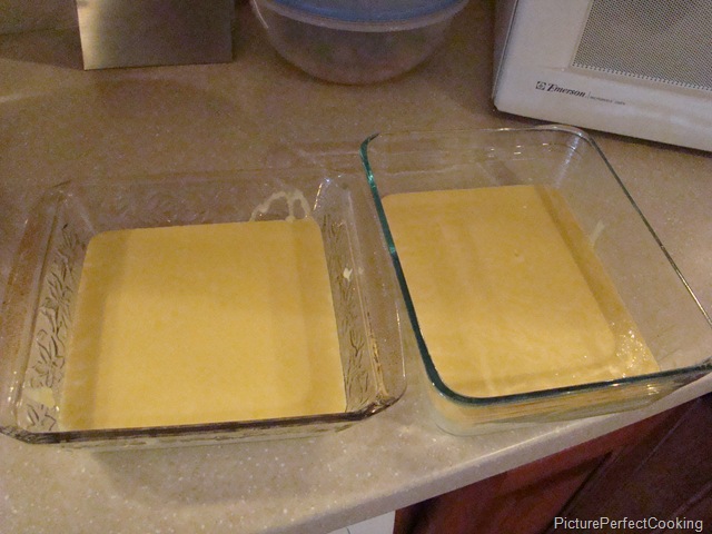 Preheat oven to 350 degrees.  Prepare cake batter as directed on the package.  Pour into a greased 13×9” baking pan. (Since I was taking this dish to 2 different places, I used 2 8” square pans.  The cake turned out just fine.)  Set aside.