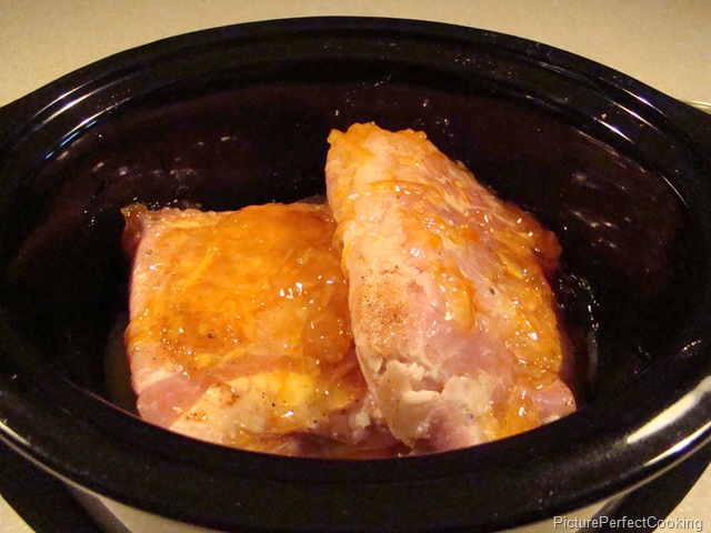 Last week, I used orange marmalade in the BBQ meatball recipe.  Of course, I had to buy a whole jar just for the half cup I needed for the meatballs, so I tried to come up with a way to use the rest of the jar.  I had planned on cooking a pork loin in the crock later that week and I had an idea that I could use the marmalade on that.  It worked great!  It was so easy and really good.  You can see from the photos of the finished product below that the orange flavor really soaked into the meat, but it was not over-powering at all.