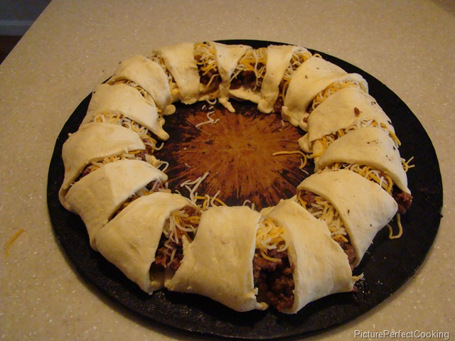 Scoop the taco filling onto the crescent roll circle and top with the cheese. Bring the points of the triangles up over the filling and tuck under at the center to form the ring.