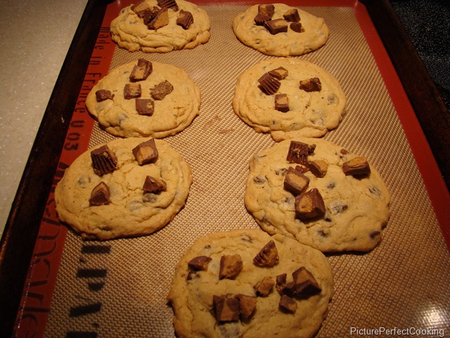 Scoop the dough onto a prepared cookie sheet and use your hand to slightly flatten each cookie. Cook for 12 minutes. Remove from the oven and lightly press about 6 to 8 pieces of the chopped peanut butter cups onto each cookie. Return the cookies to the oven to bake for another 2 minutes. Cool on the sheet for about 5 minutes before moving to a cooling rack. I like to use two cookie sheets so I can bake the next batch without waiting for the first to cool. Enjoy with a cold glass of milk!