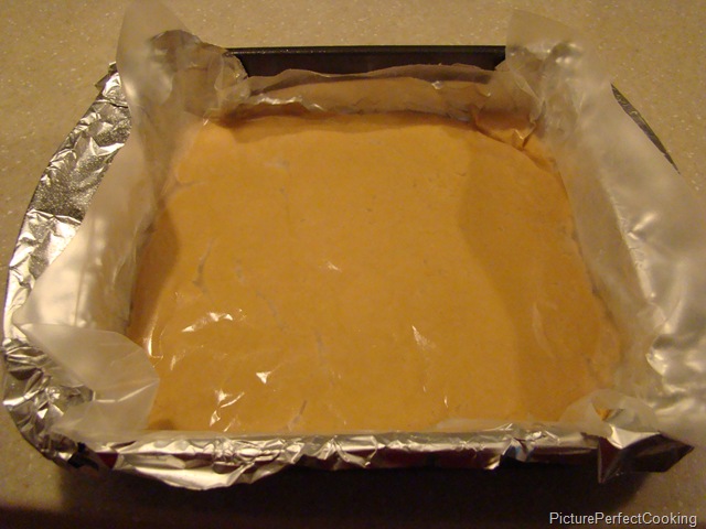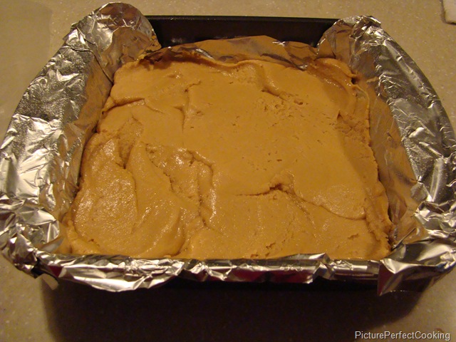 Line a 8 or 9 inch baking pan with foil. Spray with non-stick spray. Put the butter and peanut butter into a large microwave safe bowl. Microwave this combo for 2 minutes on high. Stir to combine and microwave for another 2 minutes on high. Add the vanilla and powdered sugar to the peanut butter mixture with a wooden spoon.