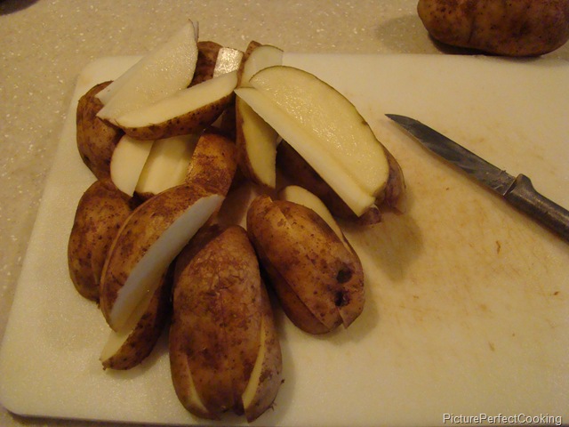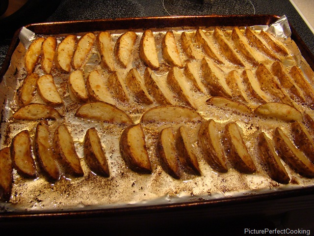 Preheat oven to 450 degrees. Line a baking sheet with aluminum foil and spray with non-stick cooking spray. Slice the potatoes into 8 wedges each and set aside. Melt the butter in a large microwave safe bowl. I set the microwave on 50% power for 1 minute. Check the butter and microwave for an additional 30-45 seconds on 50% power if needed. Add the seasoning to the melted butter.