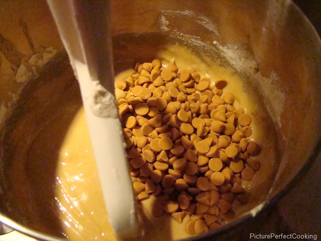 Stir in the vanilla extract. Add the flour mixture until thoroughly combined. Fold in the butterscotch chips. Pour into the prepared pan.