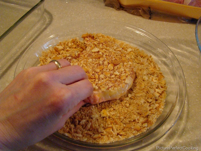 Dip the pork chops in the egg mixture and then coat in the cracker crumbs.