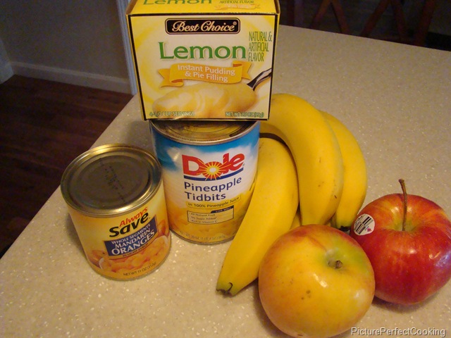 This is one of those dishes…perfect to pair with a simple angel food cake or, like I did, a lemon chiffon cake. I have made fruit salads with vanilla pudding mix, but I had never used lemon. I think I like it better than the vanilla since it gave it an extra little kick. Don’t forget to add your bananas right before you serve so they will stay as fresh as possible. The original recipe called for strawberries. I didn’t have any on hand so I just used chopped apples instead. I will definitely try this again when my strawberry plants start producing.
