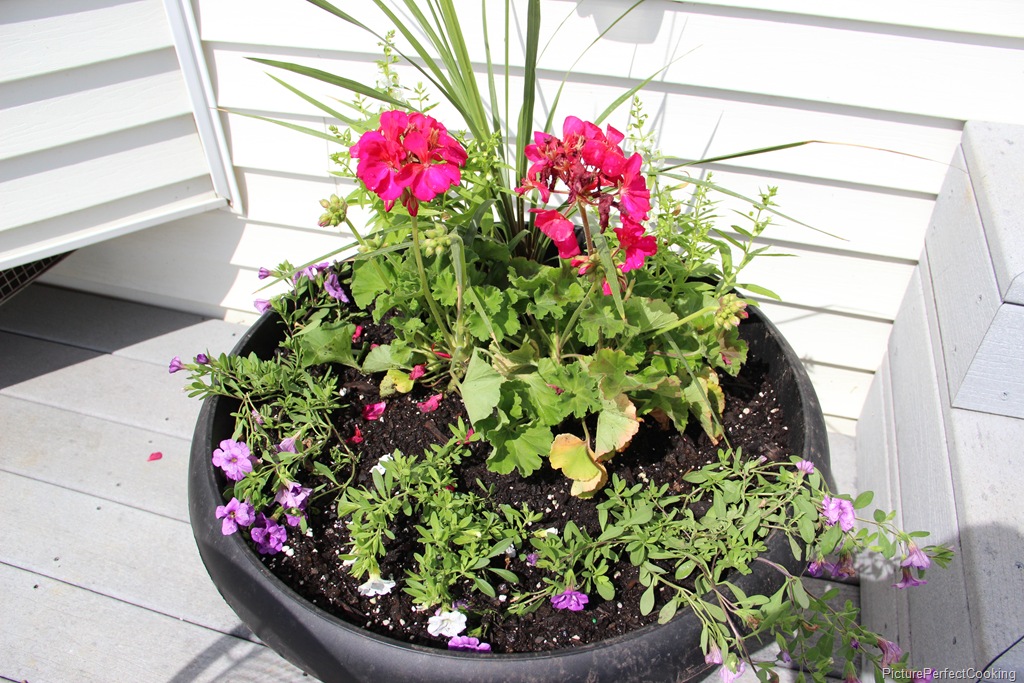 In the two flower pots I have on the back deck, I used hot pink geraniums with white summer snapdragons, white calibrachoa and a spike.