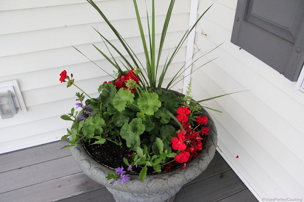 On the front porch pots, I always do red, white and blue so this year it is filled with a spike, red geraniums (with the biggest blooms I have ever seen), white summer snapdragons, and blue fan flower.