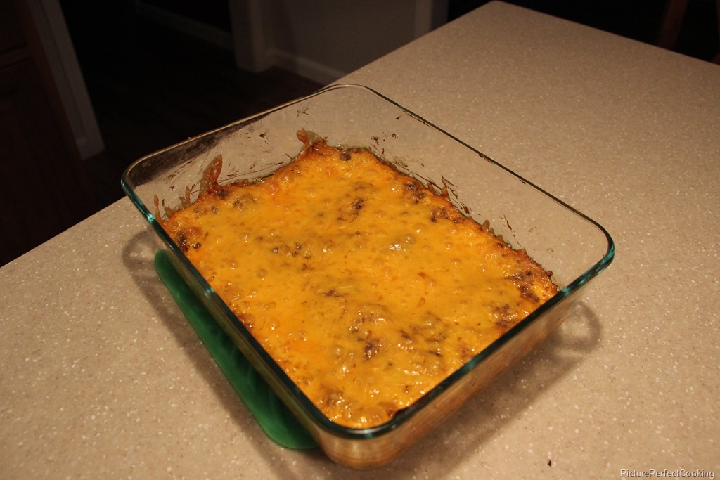Preheat oven to 400 degrees and spray a pie pan (or rectangle baking pan) with nonstick spray.  The pan I used is about 6×8”.  In a skillet over medium heat, cook the ground beef, onion and minced garlic until the beef is cooked through.