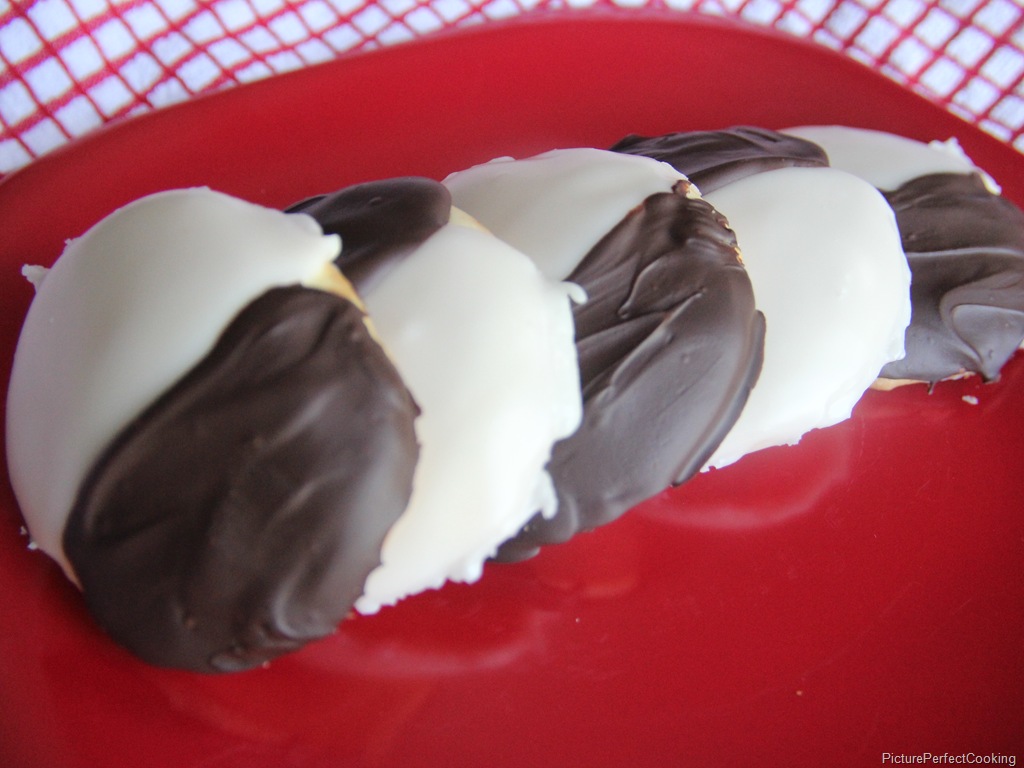 My chocolate seized and there was nothing I could do to make it smooth again. I put the bowl over another bowl of simmering water to loosen it and that didn’t work. I even tried microwaving it for a few seconds and NOTHING! So, the “black” part of my cookies is just melted semi-sweet chocolate chips. Don’t get me wrong…the melted chips worked find, but it just wasn’t the same. Oh, well, you win some and you lose some.