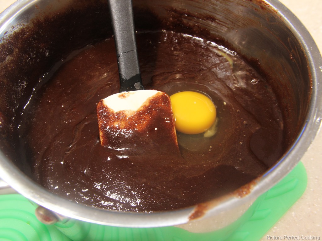 Add about 1/3 of the flour/cocoa mixture at a time to the egg mixture. Gently fold this in with a spatula. Fold about 1 cup of the cake batter into the melted butter. Then pour the melted butter/batter into the remaining cake batter. Gently fold until it is completely combined.