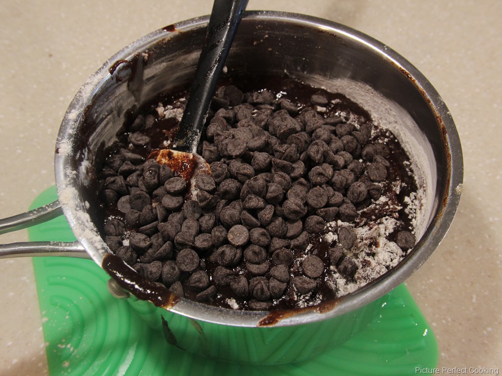 Pour enough water into a skillet to reach a depth of 1 inch. Bring this water to a simmer. Pour the chocolate chips into a glass bowl and place this into the simmering water. Turn off the heat and stir until the chocolate is melted. Remove the bowl from the water and allow the chocolate to cool.