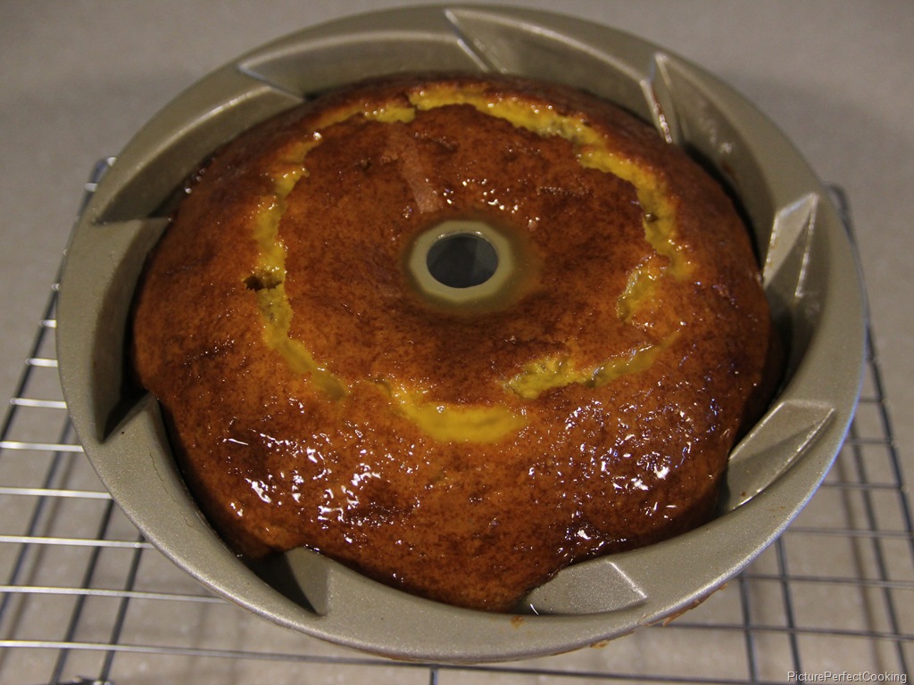 While the cake is still in the pan, poke several holes into the cake with a knife and pour the glaze over it.  Then let the cake cool for 10 minutes before removing it from the pan to cool.  The sauce should soak into the cake completely in that 10 minutes.  If it hasn’t, just wait another 5 minutes or so before turning out the cake.