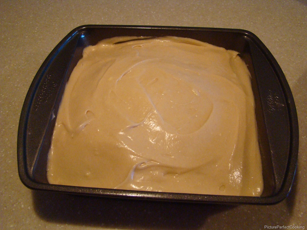 Prepare the cake mix according to package directions, baking it in a 9×13” baking dish. (Note: I used 2 square 8” dishes because I was taking this to 2 different places.)
