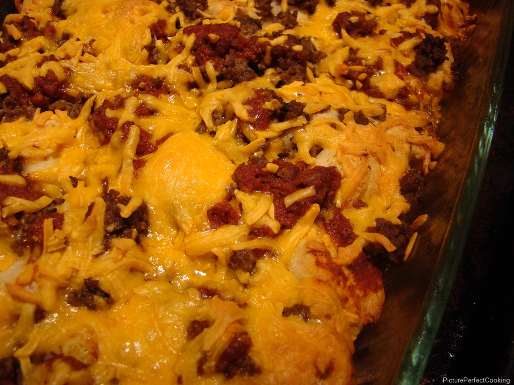 Layer the taco meat mixture next, then add the chili and cheese.  Bake for 25 to 30 minutes until the biscuits are golden brown.  Enjoy with your favorite taco toppings.
