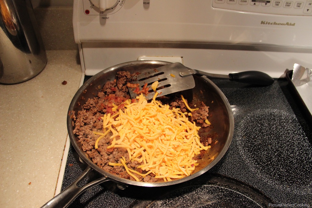 Cook the ground beef over medium heat until there is no pink left.  Add the minced onion, bacon, and cheese; stir to combine and set aside.