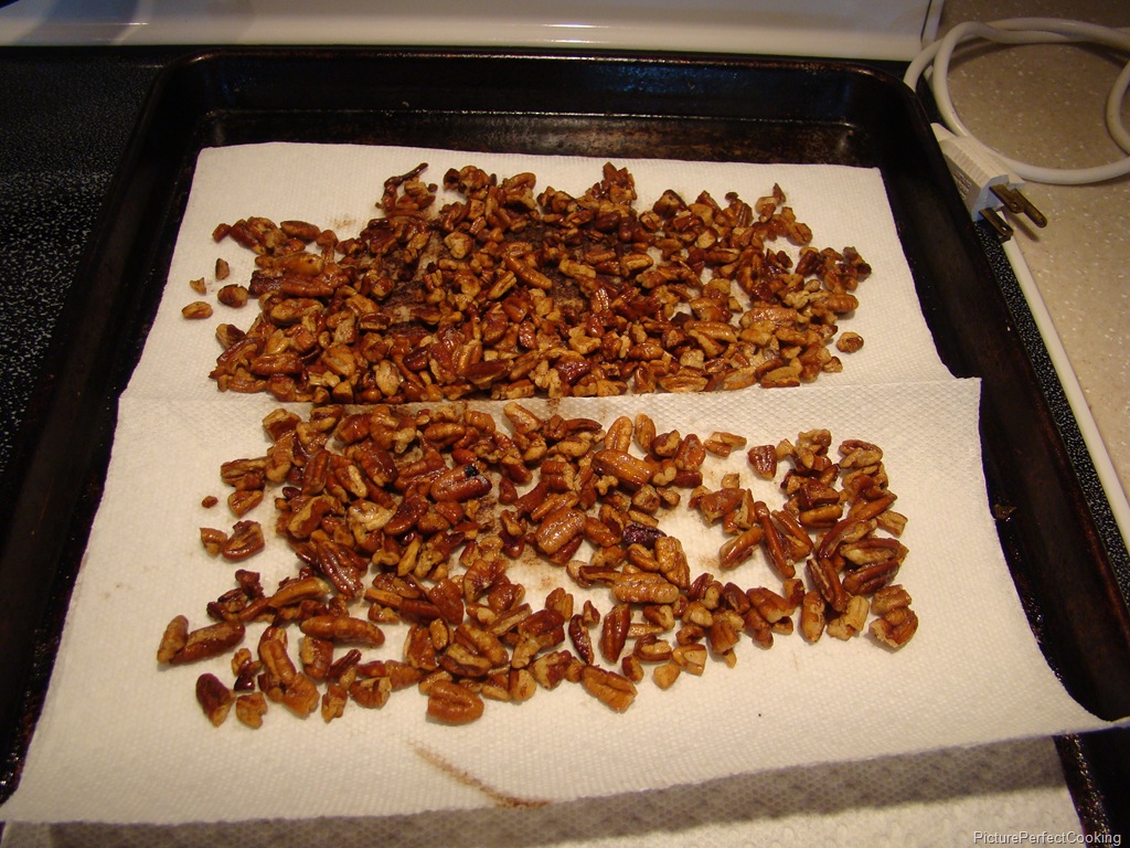 Melt the butter in a small saucepan. Cook the pecans over low heat until they are lightly browned, about 3 minutes. Place on a paper towel to drain and cool.