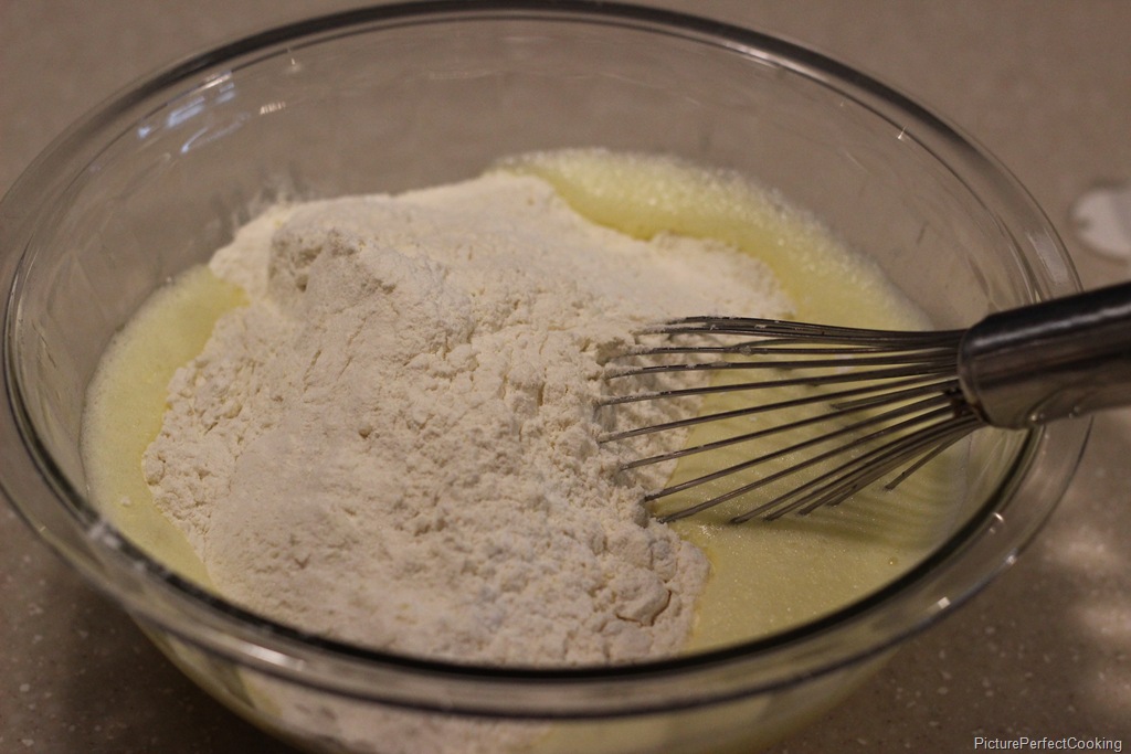 Add the boiled mixture to the flour mixture and combine. Then add eggs and vanilla extract. Pour the batter into the baking pans and cook for 25-30 minutes or until a toothpick inserted in the center of cake comes out clean. Let cool in the pans for 10 minutes then remove and cool completely.