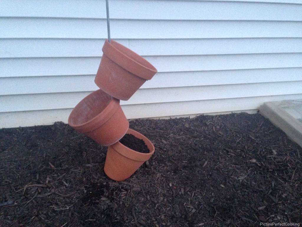 It turned out to be pretty simple and just required a five foot metal rod purchased from Lowe’s, 5 clay pots, gravel, potting soil and flowers. I am not sure what size rod we bought, but it was small enough to fit through the flower pots’ drainage holes but big enough to be sturdy. C drove pushed the rod into the ground as far as he could and still have enough to hold all of the pots.