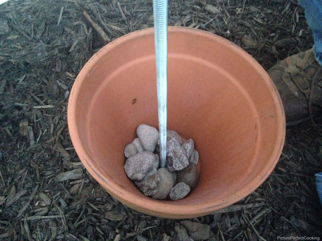 Then thread the largest of your pots onto the rod. Line the bottom with gravel , tilt the pot to one side, and fill with potting soil Next year, we will probably get a bigger pot for the bottom so it will offer more support.