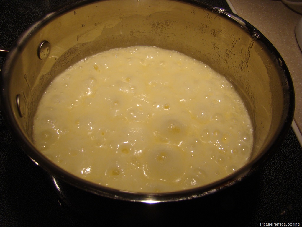 While the cake is cooling, combine the sugar, milk, shortening, butter, and salt in a medium heavy saucepan.  Bring to a rolling boil, stirring constantly to prevent scorching.  Once it reaches a rolling boil, stop stirring and let boil for 1-2 minutes, or until it reaches the soft-ball stage.