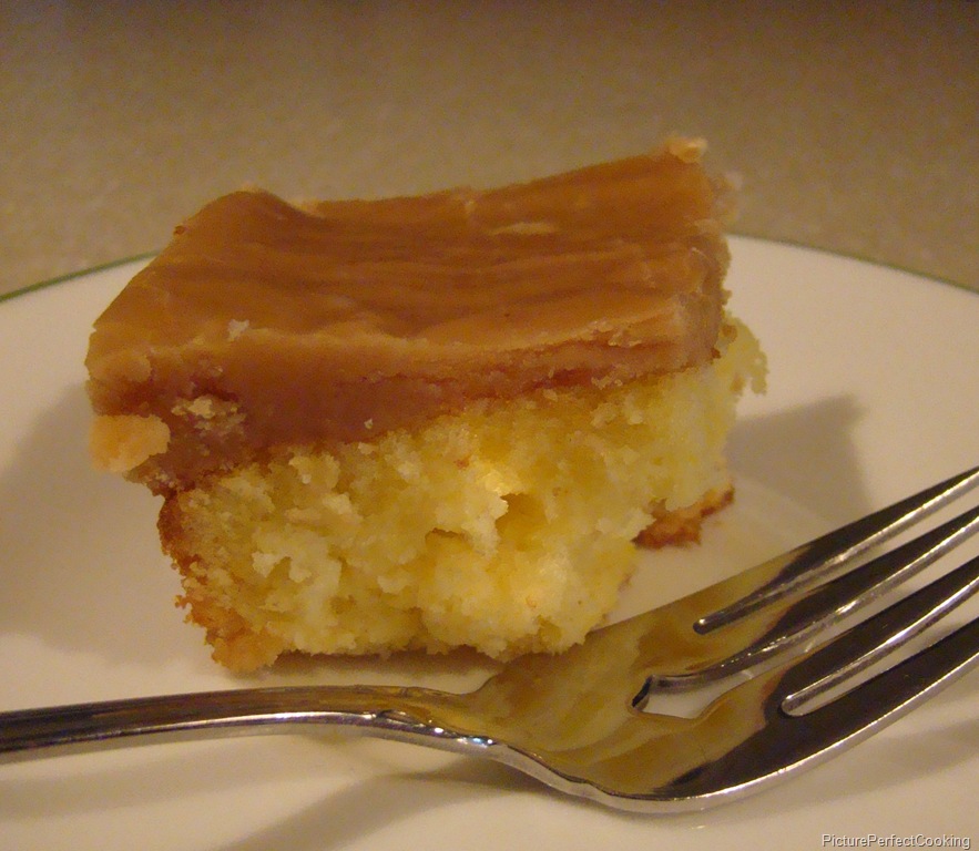 This recipe was a tease for a few weeks on the Menu Plan Monday posts because I just couldn’t seem to get it made. Well, I finally did and it was very good!  The cake part is just a plain yellow cake made from a mix which is good, but the boiled icing made it great!  The cooked frosting sets up until it is almost fudge like in consistency, so work fast after you take it off the heat.
