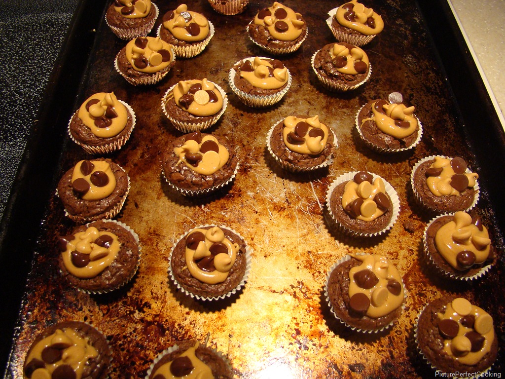 They combine two of my favorite flavors (chocolate and peanut butter, of course) and they are pretty to look at, too.  Now I didn’t go quite as far as she did and put a homemade peanut butter cookie on top, but I did add a few peanut butter chips to the cupcake batter.