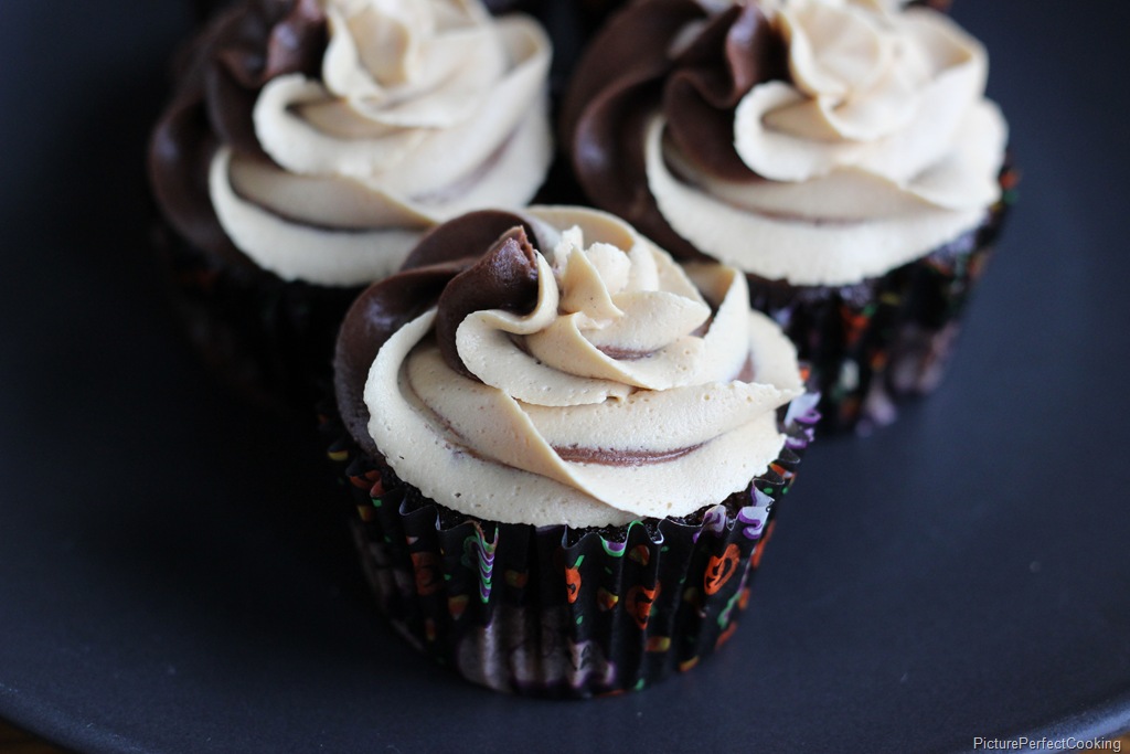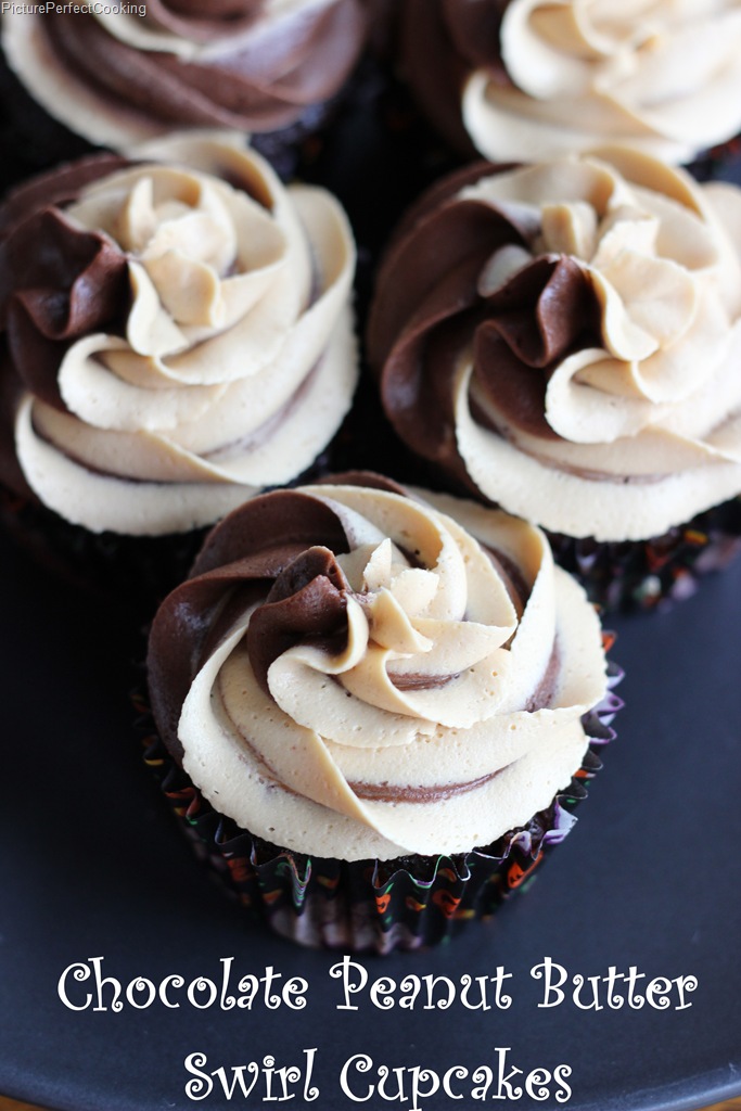 I didn’t get enough action shots for the recipes so this will be a text recipe only with some pretty finished shots thrown in.  Without further ado, I give you (drumroll, please): Chocolate Peanut Butter Swirl Cupcakes: