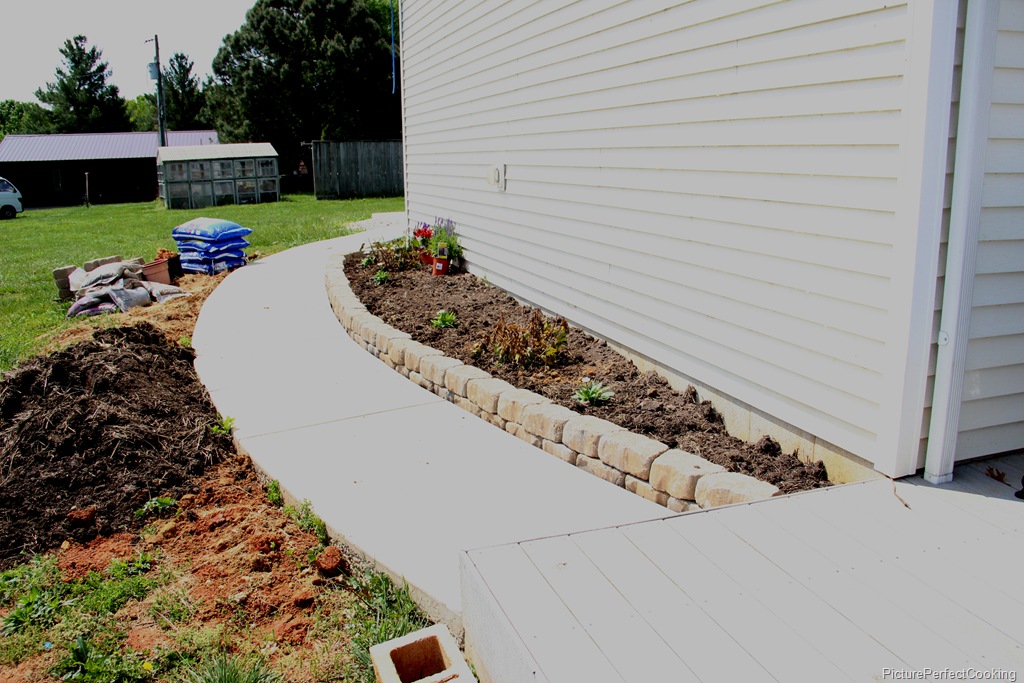 I am so glad that I didn’t jump the gun and try to sow seeds of veggies that need the warmth. I guess I had better confess that I didn’t do this because of my smarts, but because I just didn’t have the beds ready. God watches over us all the time! The early warm weather has given us time to do a few projects around the house. Last year, we had a concrete driveway and two sidewalks poured so this year we built a raised flower bed between one sidewalk and the garage. We still like a few more details, but here is a sneak peek: