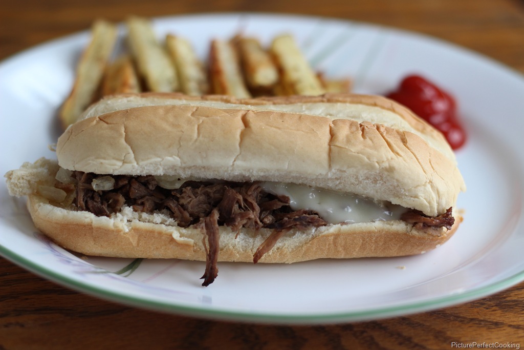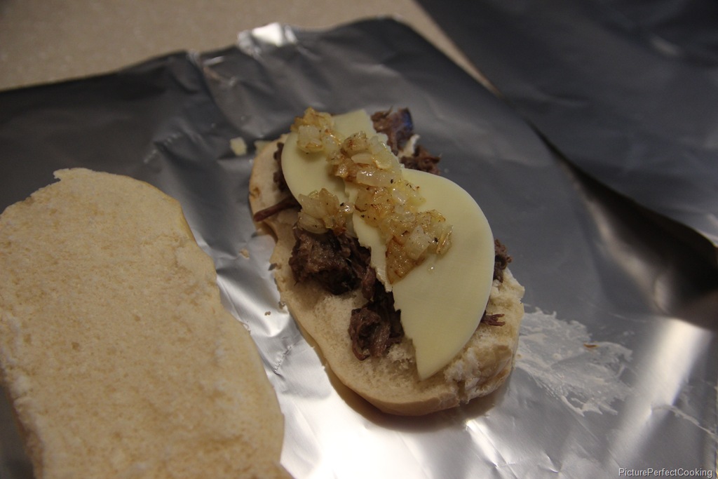 Preheat the oven to 375 degrees. Spread a little butter on the inside of each hoagie roll then layer some of the beef, cooked onion and a slice of provolone cheese. Wrap each sandwich in aluminum foil. Bake for 5 to 8 minutes or until the cheese is melted. Serve and enjoy!